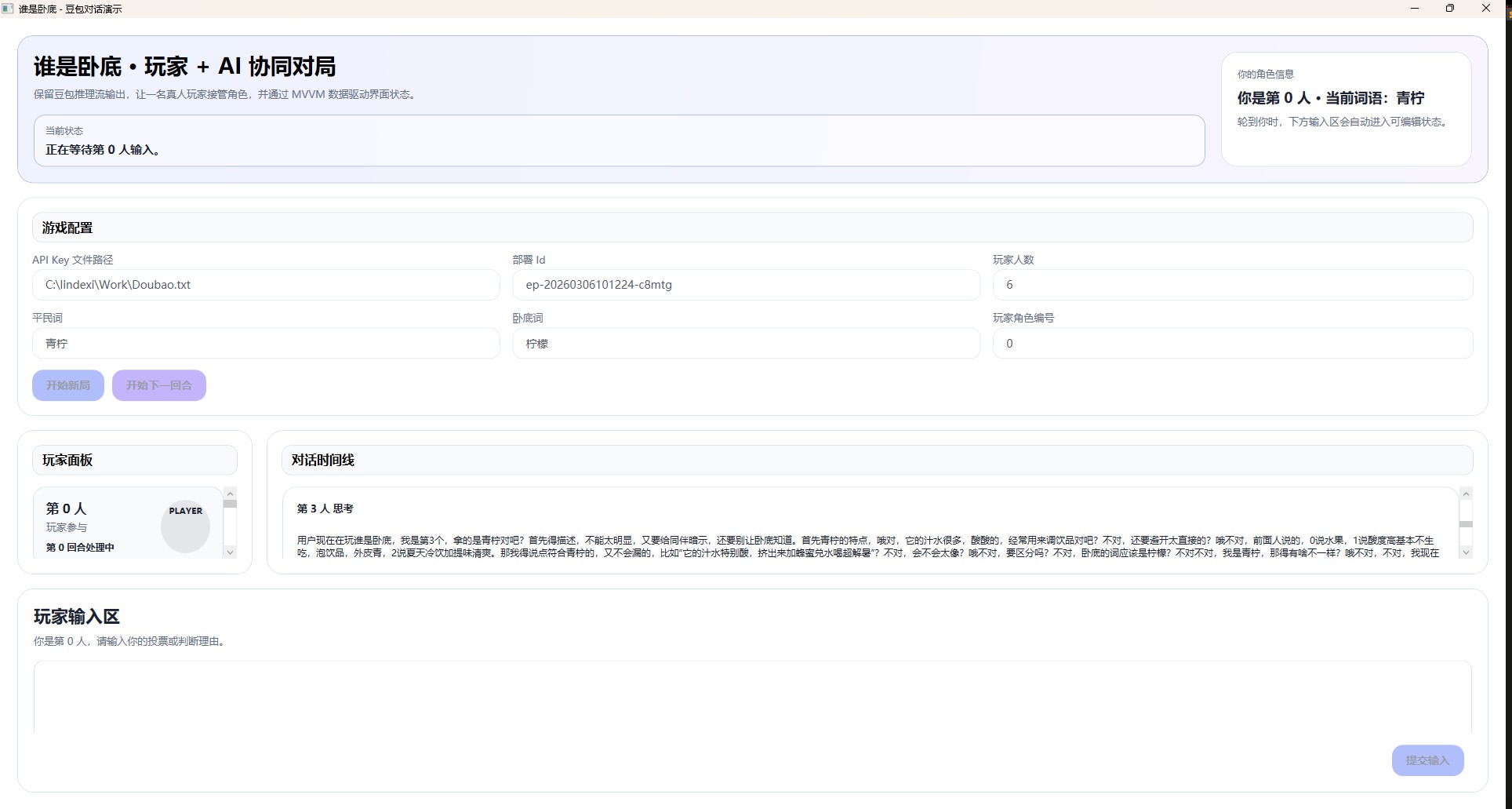 我准备参考 《用 Microsoft Agent Framework 对接豆包大模型实现AI自动玩「谁是卧底」游戏》 博客提供的知识,编写一个 WPF 的应用程序。要求能够在界面显示对话的功能,以及能够分配其中一个角色给到用户进行输入参与。这个应用做的不是完全自动、全部由 AI 玩的游戏,而是将其中一个角色交给玩家参与输入。你需要先分析需求,列举出实现需求的技术细节点,然后设计界面,再完成界面的编写以及后台代码逻辑,如果你发现某个模块比较复杂,应该先在前面列举出计划,然后再细分模块完成任务提示词二:
