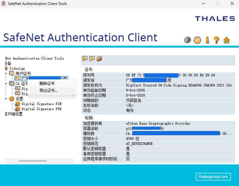 1 导出证书为 Codesign.cer 文件。右击对应的证书,选择导出,保存到文件即可。导出的 cer 格式的证书文件将不包含私钥,需要使用以下步骤获取 CSP 名和其对应的私钥容器名参数才能让 SignTool 从硬件设备获取私钥用于签名