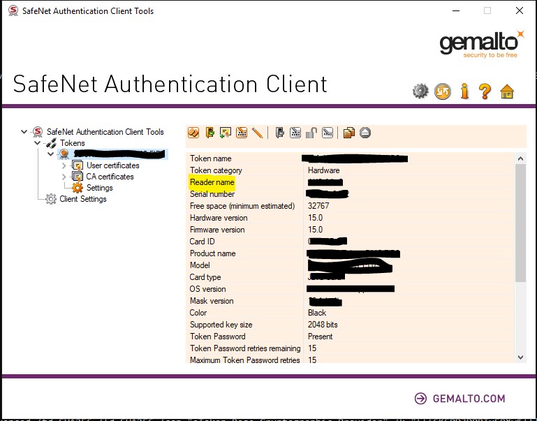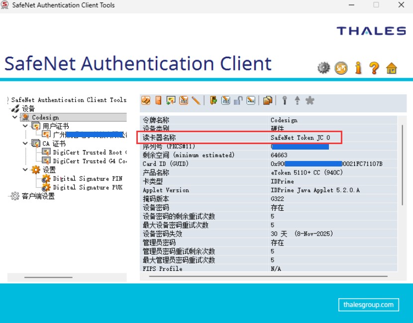 如我的读卡器名 reader 为 SafeNet Token JC 0