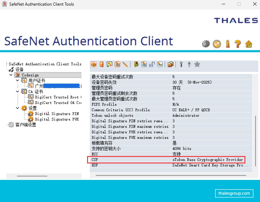 我的 CSP 名为 eToken Base Cryptographic Provider