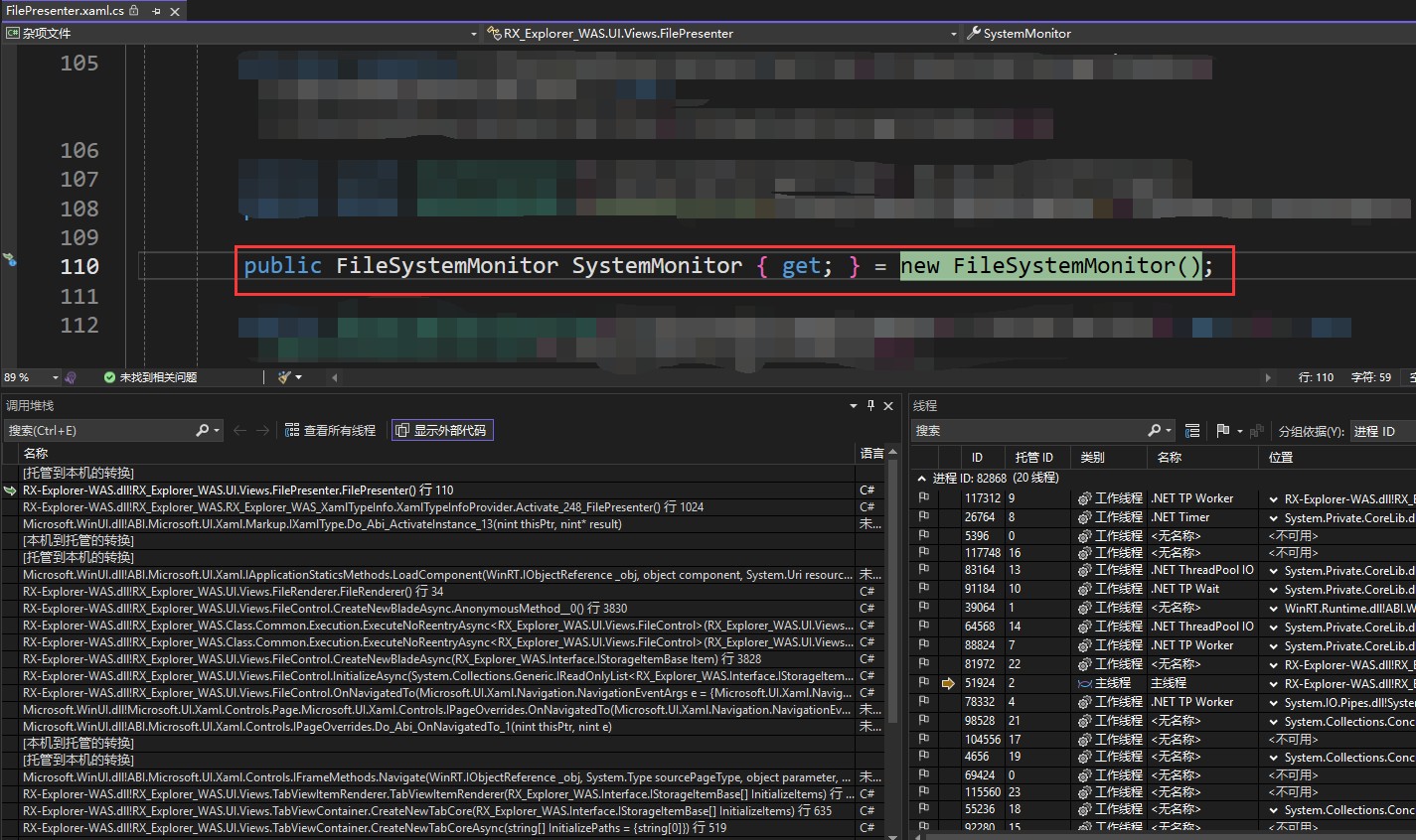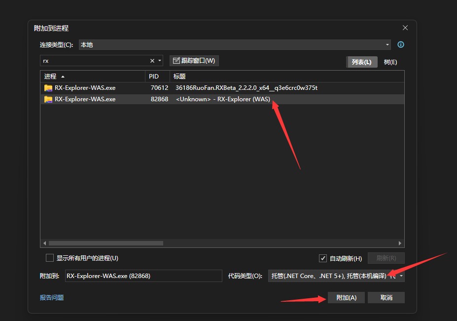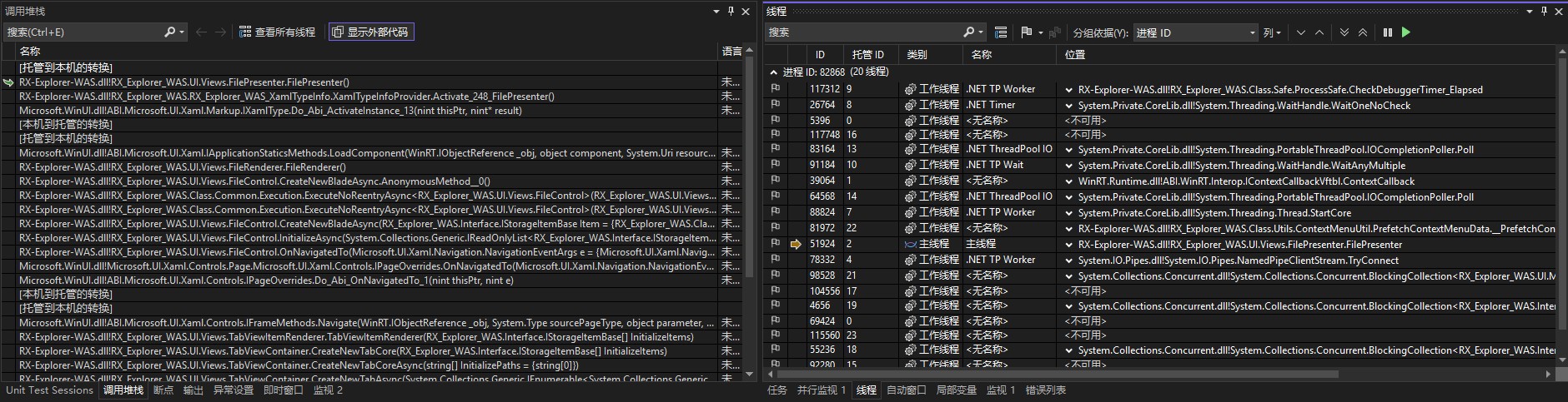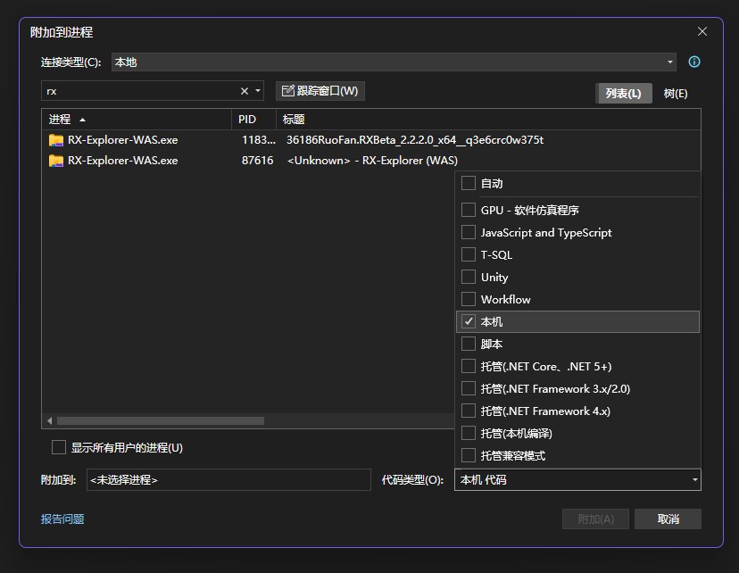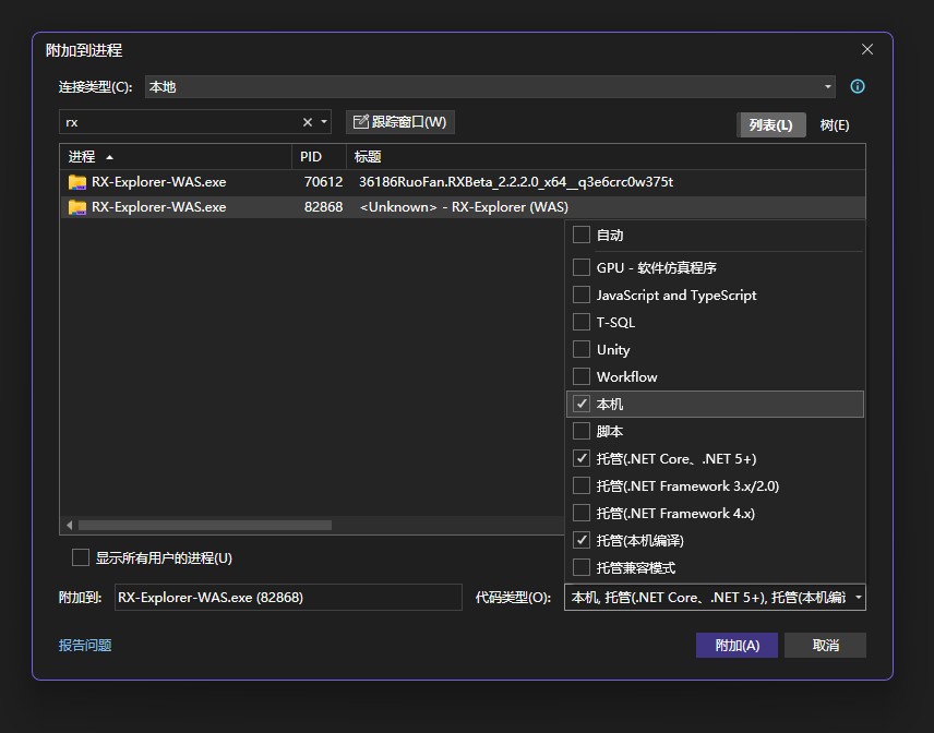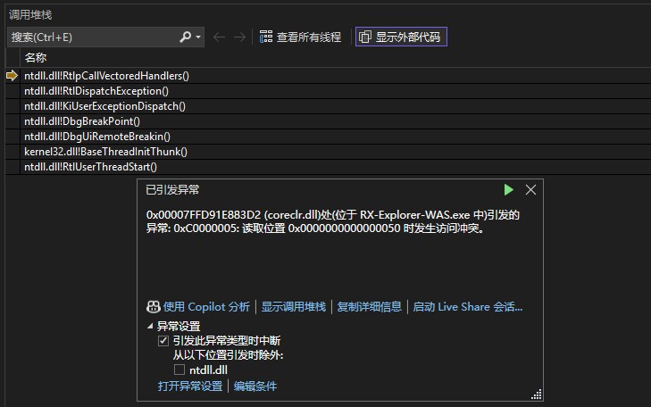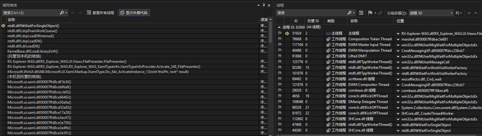 [托管到本机的转换]> RX-Explorer-WAS.dll!RX_Explorer_WAS.UI.Views.FilePresenter.FilePresenter() 行 110 C# RX-Explorer-WAS.dll!RX_Explorer_WAS.RX_Explorer_WAS_XamlTypeInfo.XamlTypeInfoProvider.Activate_248_FilePresenter() 行 1024 C# Microsoft.WinUI.dll!ABI.Microsoft.UI.Xaml.Markup.IXamlType.Do_Abi_ActivateInstance_13(nint thisPtr, nint* result) 未知停下调试,再次附加进程,这一次勾选了本机调试选项