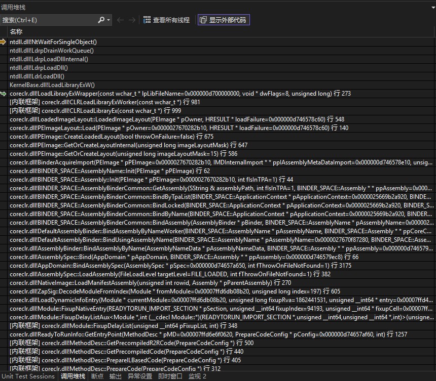 我点击停止调试,准备这一次只开启本机调试方式进行附加调试。只开启本机调试的方式,可以展示出整个 CoreCLR 的执行过程,如此可以看到在加载的发起方 CoreCLR 的调用堆栈,进而了解到正在加载的程序集是哪个