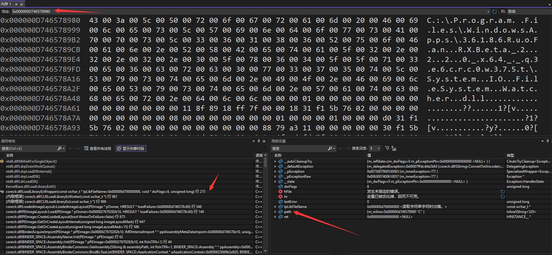 ntdll.dll!NtWaitForSingleObject() 未知 ntdll.dll!LdrpDrainWorkQueue() 未知 ntdll.dll!LdrpLoadDllInternal() 未知 ntdll.dll!LdrpLoadDll() 未知 ntdll.dll!LdrLoadDll() 未知 KernelBase.dll!LoadLibraryExW() 未知> coreclr.dll!LoadLibraryExWrapper(const wchar_t * lpLibFileName=0x000000d700000000, void * dwFlags=8, unsigned long) 行 273 C++ [内联框架] coreclr.dll!CLRLoadLibraryExWorker(const wchar_t *) 行 981 C++ [内联框架] coreclr.dll!CLRLoadLibraryEx(const wchar_t *) 行 999 C++ coreclr.dll!LoadedImageLayout::LoadedImageLayout(PEImage * pOwner, HRESULT * loadFailure=0x000000d746578c60) 行 548 C++ coreclr.dll!PEImageLayout::Load(PEImage * pOwner=0x0000027670282b10, HRESULT * loadFailure=0x000000d746578c60) 行 140 C++ coreclr.dll!PEImage::CreateLoadedLayout(bool throwOnFailure=false) 行 675 C++ coreclr.dll!PEImage::GetOrCreateLayoutInternal(unsigned long imageLayoutMask) 行 647 C++ coreclr.dll!PEImage::GetOrCreateLayout(unsigned long imageLayoutMask=15) 行 586 C++ coreclr.dll!BinderAcquireImport(PEImage * pPEImage=0x0000027670282b10, IMDInternalImport * * ppIAssemblyMetaDataImport=0x000000d746578e10, unsigned long * pdwPAFlags=0x000000d746578e20) 行 125 C++ coreclr.dll!BINDER_SPACE::AssemblyName::Init(PEImage * pPEImage) 行 62 C++ coreclr.dll!BINDER_SPACE::Assembly::Init(PEImage * pPEImage=0x0000027670282b10, int fIsInTPA=1) 行 44 C++ ...点击进入 LoadLibraryExWrapper 这一行,此时我习惯让 Visual Studio 的调试界面一边是调用堆栈,一边是局部变量窗口。如此可以在切调用堆栈时,看到各个方法的局部变量情况。此时我看到了有 path 变量,再点击 Visual Studio 的 调试->窗口->内存->内存1 选项卡,打开内存查看窗口。在内存查看窗口,输入 path 变量的地址,此时就看到了准备加载的路径