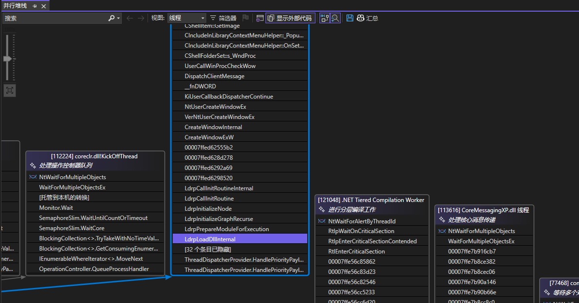 打开 调试->窗口->并行堆栈 窗口,作为熟练工,我很快就定位到一个线程正在一个加载 DLL 的堆栈