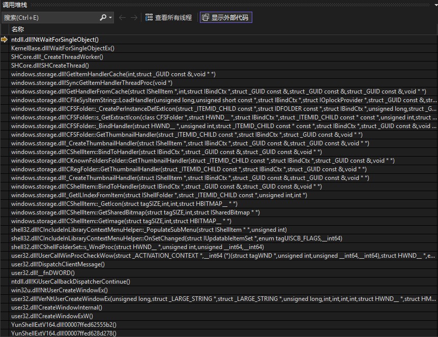 ... user32.dll!UserCallWinProcCheckWow(struct _ACTIVATION_CONTEXT *,__int64 (*)(struct tagWND *,unsigned int,unsigned __int64,__int64),struct HWND__ *,enum _WM_VALUE,unsigned __int64,__int64,void *,int) 未知 user32.dll!DispatchClientMessage() 未知 user32.dll!__fnDWORD() 未知 ntdll.dll!KiUserCallbackDispatcherContinue() 未知 win32u.dll!NtUserCreateWindowEx() 未知 user32.dll!VerNtUserCreateWindowEx(unsigned long,struct _LARGE_STRING *,struct _LARGE_STRING *,unsigned long,int,int,int,int,struct HWND__ *,struct HMENU__ *,void *,void *,enum ZBID,unsigned long,unsigned long) 未知 user32.dll!CreateWindowInternal() 未知 user32.dll!CreateWindowExW() 未知 YunShellExtV164.dll!00007ffed62555b2() 未知 YunShellExtV164.dll!00007ffed628d278() 未知 YunShellExtV164.dll!00007ffed6292a69() 未知 YunShellExtV164.dll!00007ffed6298520() 未知 ntdll.dll!LdrpCallInitRoutineInternal() 未知 ntdll.dll!LdrpCallInitRoutine() 未知 ntdll.dll!LdrpInitializeNode() 未知 ntdll.dll!LdrpInitializeGraphRecurse() 未知 ntdll.dll!LdrpPrepareModuleForExecution() 未知 ntdll.dll!LdrpLoadDllInternal() 未知 ntdll.dll!LdrpLoadDll() 未知 ntdll.dll!LdrLoadDll() 未知 KernelBase.dll!LoadLibraryExW() 未知 combase.dll!00007fff16b53865() 未知 ... windows.storage.dll!_SHCoCreateInstance(struct _GUID const &,struct IUnknown *,unsigned long,int,enum EXTCOCREATEFLAGS,struct _GUID const &,void * *) 未知 windows.storage.dll!SHExtCoCreateInstance() 未知 shell32.dll!DCA_SHExtCoCreateInstance() 未知 shell32.dll!HDXA_QueryContextMenu(struct _DSA *,struct IDataObject *,unsigned int,struct HKEY__ * * const,class ATL::CComPtr<struct IAssociationElement> * const,struct _ITEMIDLIST_ABSOLUTE const *,struct _QCMINFO *,unsigned int,struct _DCA *,unsigned int * const,struct IUnknown *,struct _DCA *) 未知 shell32.dll!CDefFolderMenu::QueryContextMenu(struct HMENU__ *,unsigned int,unsigned int,unsigned int,unsigned int) 未知 ContextMenuSafeEnumerator.dll!00007ffe70955c97() 未知 [托管到本机的转换] RX-Explorer-WAS.dll!RX_Explorer_WAS.Class.Utils.ContextMenuUtil.PrefetchContextMenuData.__PrefetchContextMenuDataCore|5_0(string Path) 未知 RX-Explorer-WAS.dll!RX_Explorer_WAS.Class.Utils.ContextMenuUtil.PrefetchContextMenuData() 未知 RX-Explorer-WAS.dll!RX_Explorer_WAS.Class.Providers.ThreadDispatcherProvider.ExecuteOnStandAloneThreadAsync.AnonymousMethod__0(System.__Canon Argument, System.Threading.CancellationToken CancelToken) 未知首要的调查就是卡在哪里,从 YunShellExtV164.dll 作为入手点,这个 DLL 我在应用程序所在的路径 C:\Program Files\WindowsApps\36186RuoFan.RXBeta_2.2.2.0_x64__q3e6crc0w375t 找不到,意味着这是被注入进来的或被从其他地方加载的