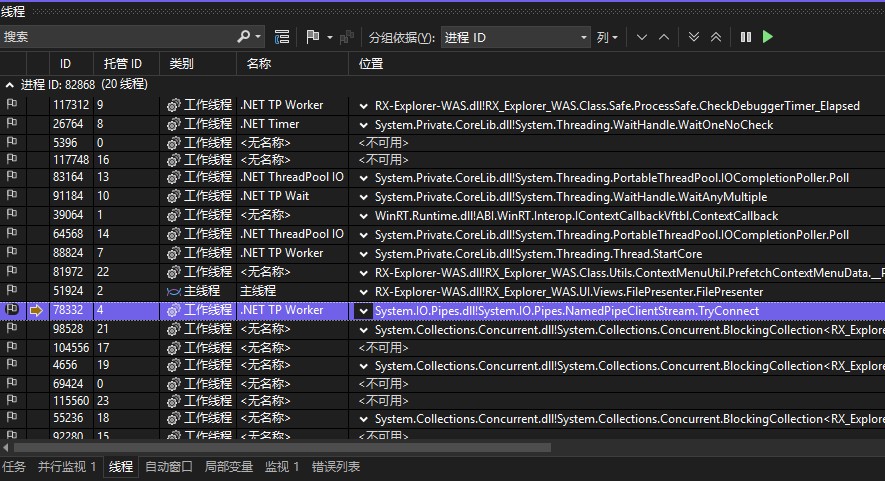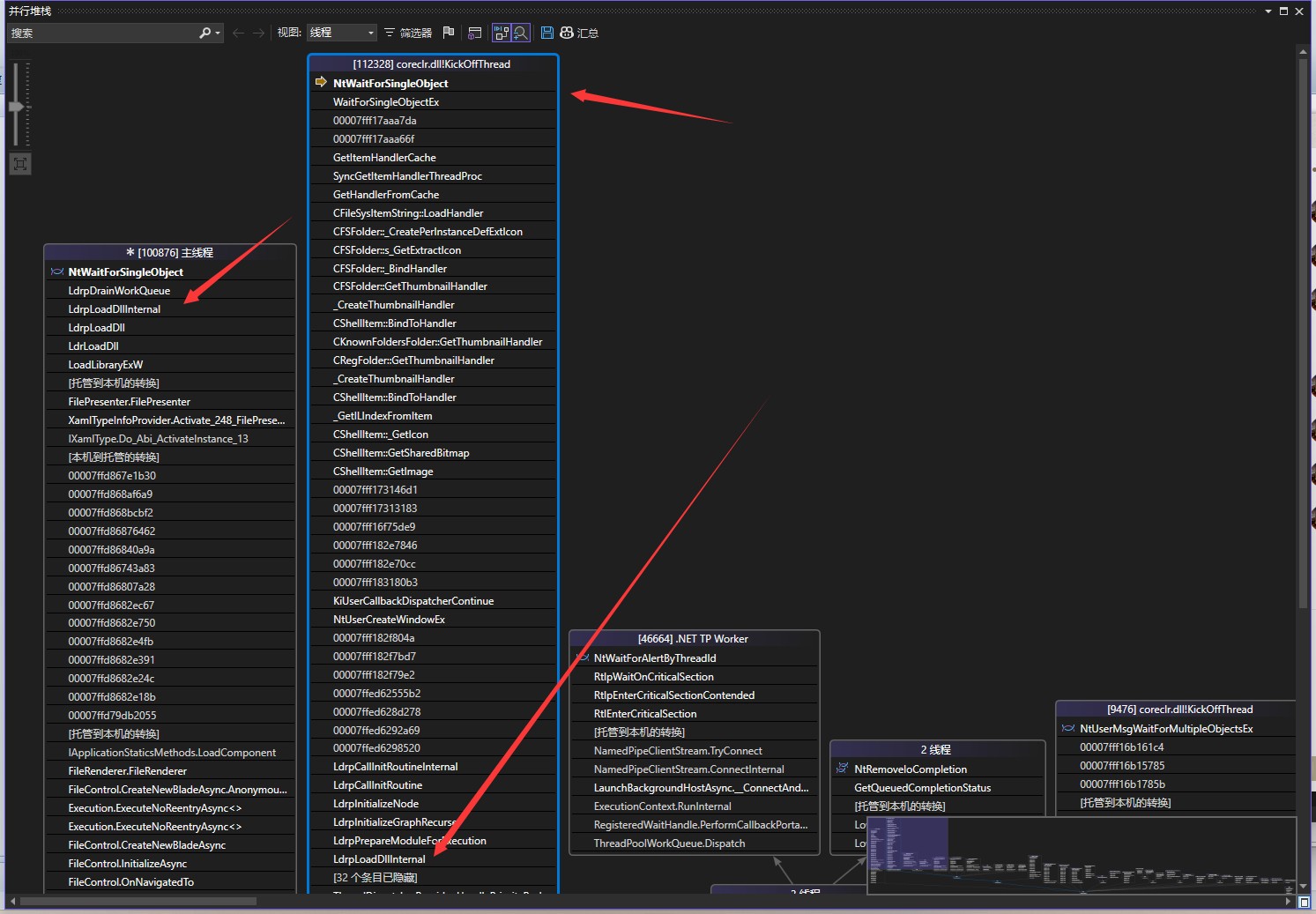ntdll.dll!NtWaitForSingleObject() 未知 ntdll.dll!LdrpDrainWorkQueue() 未知 ntdll.dll!LdrpLoadDllInternal() 未知 ntdll.dll!LdrpLoadDll() 未知 ntdll.dll!LdrLoadDll() 未知 KernelBase.dll!LoadLibraryExW() 未知 coreclr.dll!LoadLibraryExWrapper(const wchar_t * lpLibFileName=0x000000d700000000, void * dwFlags=8, unsigned long) 行 273 C++可以看到当前的状态是卡在 LdrpDrainWorkQueue 方法,即当前进程还有另一个 DLL 正在排队加载。我回忆了刚才遍历所有进程,似乎看到有可能的问题。我重新退出调试,使用带托管调试附加进程